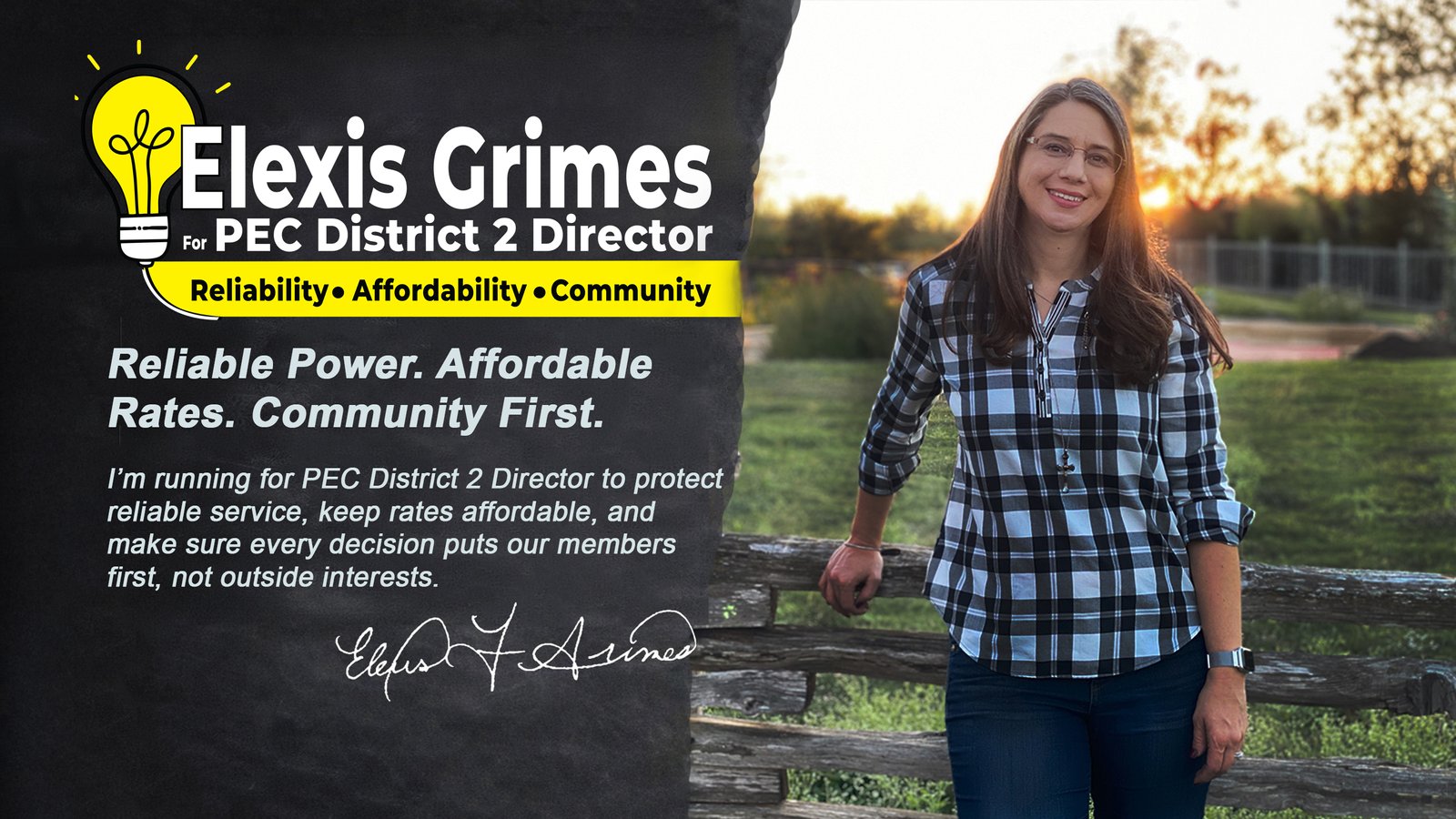 That’s why PEC matters to me. As a member-owned cooperative, it exists to serve you. I’m committed to protecting member dollars, supporting reliable and affordable power, and ensuring decisions are made with transparency and accountability.